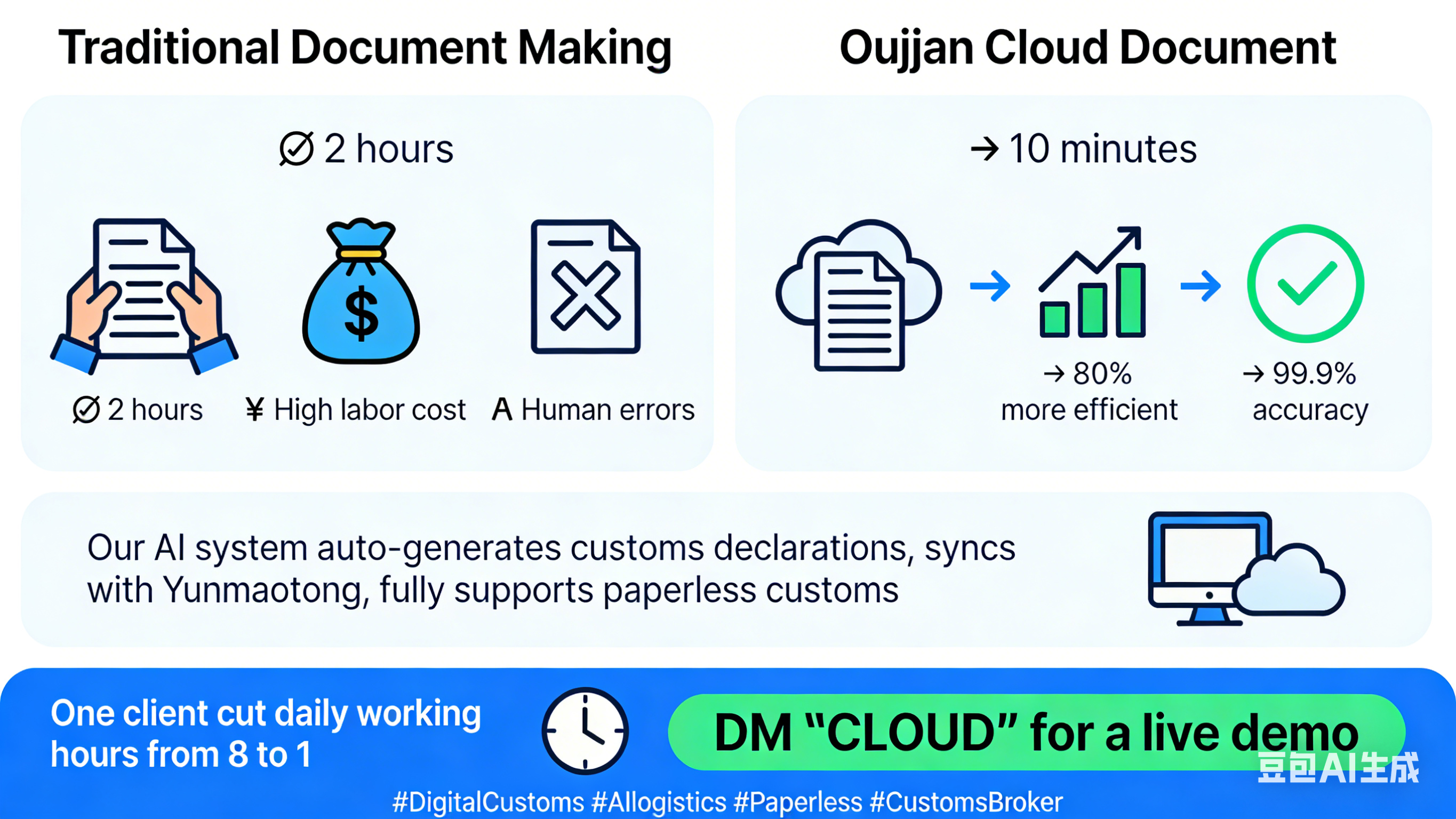 Human errors → 99.9% accuracy Our AI system auto-generates customs declarations, syncs with Yunmaotong, and fully supports paperless customs.